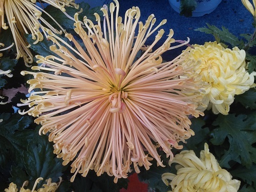 我院王子成教授担任“秋菊春展”的技术指导,关于反季节菊花的原理,他详细解释道:作为短日照植物的菊花在自然条件下是春种秋开,在八月中下旬至九月进行花芽分化,十月份以后开花。其生长期间对光照和温度的要求较高,前期日照时间逐渐加长,温度逐渐升高有利于光合产物的合成,利于菊花生长;后期日照时间逐渐缩短,温度渐低,利于菊花花芽分化与开花。而反季节菊花则刚好相反,是秋种春开,前期自然光照时间渐少,温度渐低,为达到菊花自然的生长状态需要在暖棚内延长光照时间并进行加温;四月份往后自然光照时间越来越长,温度回升,需要进行遮光处理。对于不同品系的菊花而言,可运用激素处理使开花较晚的品种尽早盛开,丰富春菊品种类型。如此运用长日照处理、短日照处理等方法,使得秋天的菊花在春季开放。