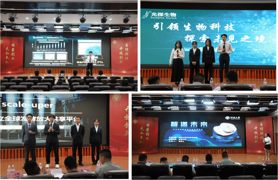 此次选拔赛分为PPT路演展示与评委提问答辩两个环节,参赛团队依次进行作品展示。汇报形式多元,内容丰富,各参赛团队以数据分析、视频案例和产品展示等形式分别从项目介绍、团队运营、市场营销、财务分析与远景目标等方面进行展示,参赛项目涵盖生物医药生产设备一体化、农业生物技术、AI科技、纳米材料等多个领域。评委老师针对项目内容、技术实现、创新点等方面进行提问,并就参赛项目的创新性、实用性、市场前景等多方面提出了合理的建议,给予各团队明确的方向指导。参赛选手们沉着冷静、条理清晰,认真听取意见和建议,进而更好地完善作品。